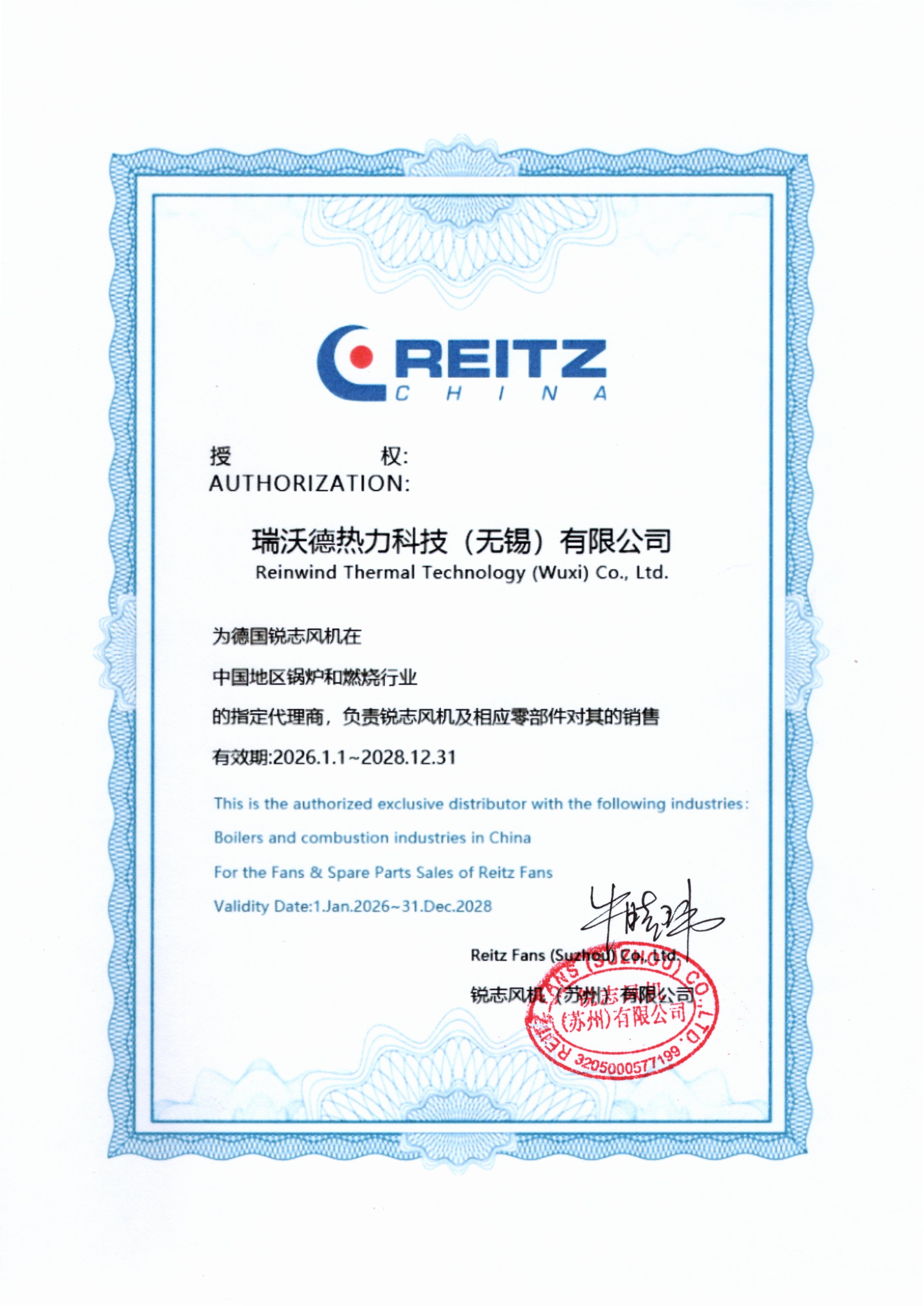 瑞沃德公司取得德国锐志风机锅炉和燃烧行业独家代理授权书: