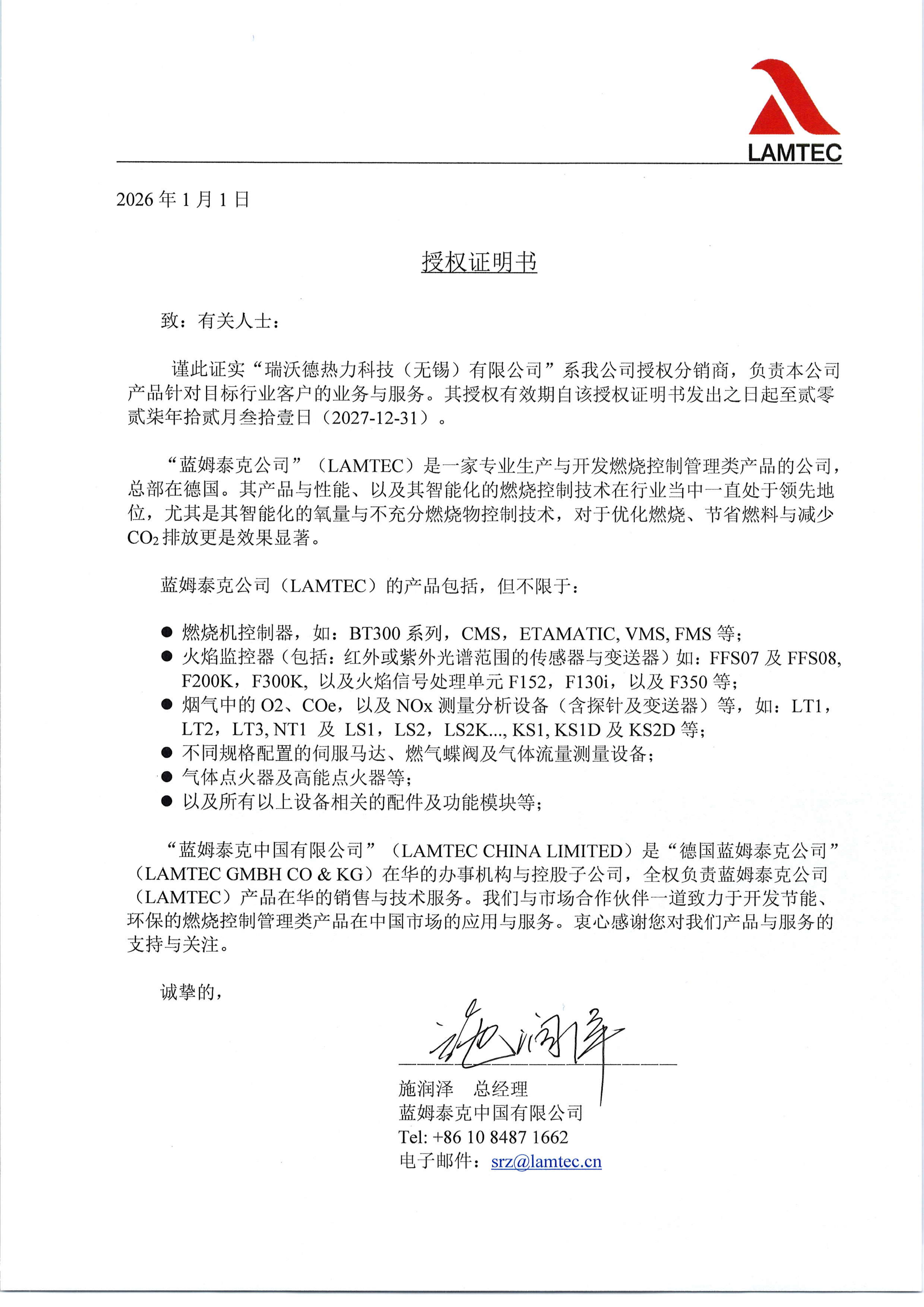 瑞沃德公司取得德国Lamtec(蓝姆泰克)公司一级代理授权书: