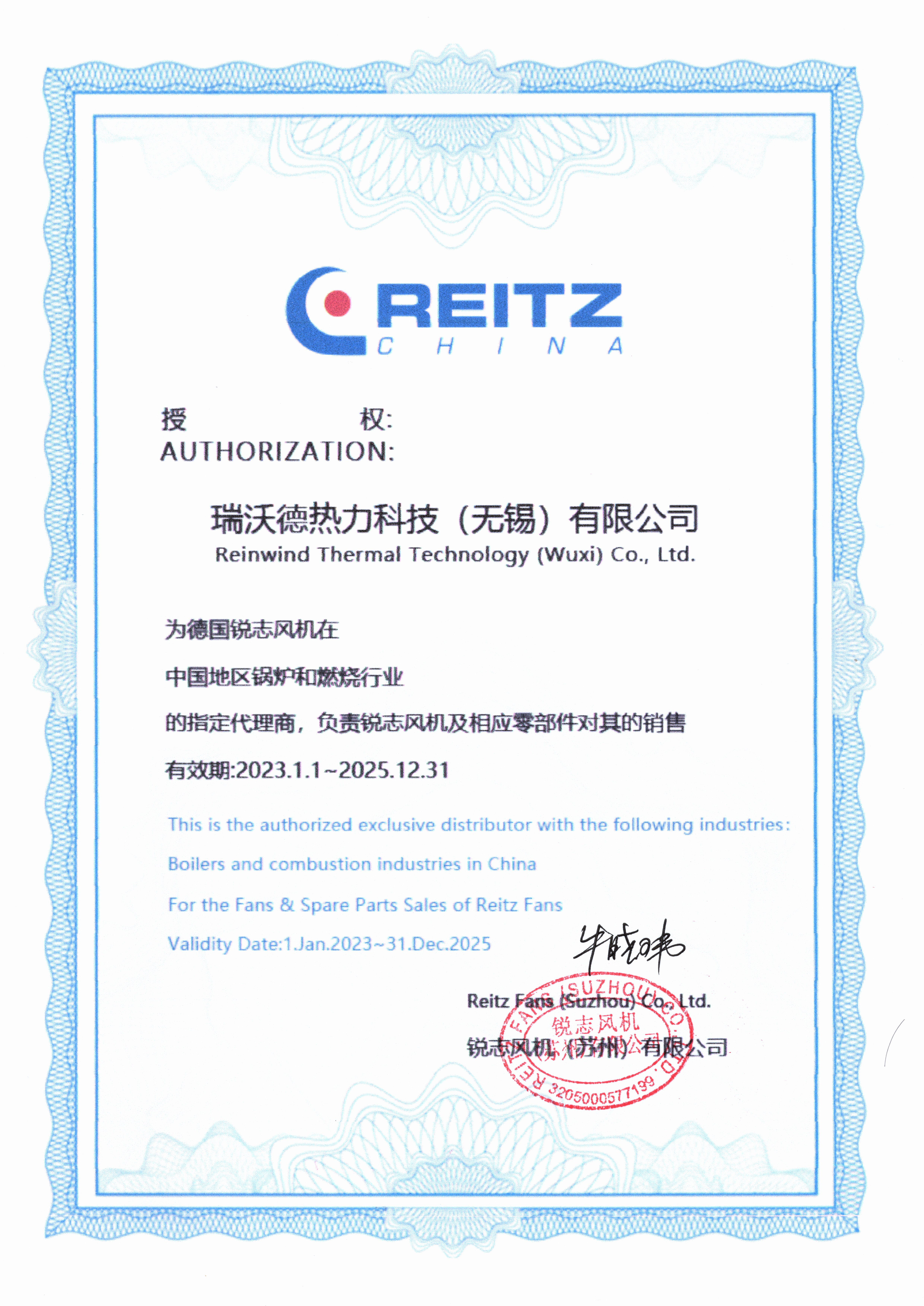 瑞沃德公司取得德国锐志风机锅炉和燃烧行业独家代理授权书: